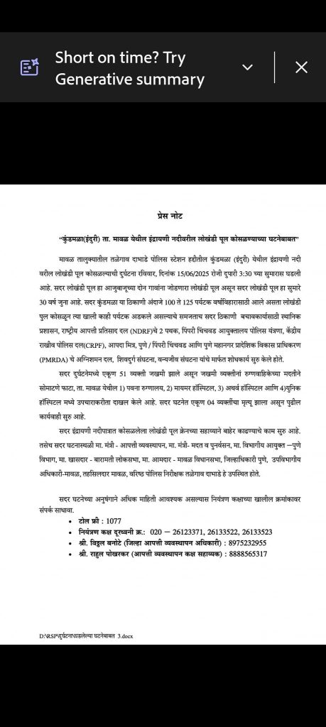 मावळ तालुका, पुणे – कुंडमळा (इंदुरी), ता. मावळ येथील इंद्रायणी नदीवर असलेला लोखंडी पूल 15 जून 2025 रोजी दुपारी 3:30 वाजता कोसळल्याची गंभीर दुर्घटना घडली. हा पूल इंदुरी आणि आसपासच्या गावांना जोडणारा महत्त्वाचा पूल होता.