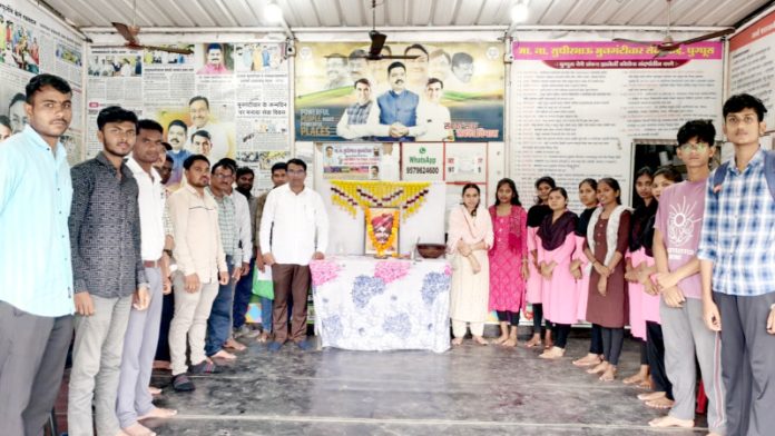 घुग्घुस (चंद्रपूर) : येथील मा. आ. सुधीरभाऊ मुनगंटीवार सेवा केंद्रातर्फे गुरुवार, २६ जून रोजी राजर्षी छत्रपती शाहू महाराज यांची जयंती साजरी करण्यात आली. या कार्यक्रमात महाराजांच्या प्रतिमेला माल्यार्पण करून अभिवादन करण्यात आले.