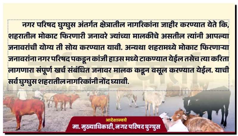 घुग्घुस (चंद्रपुर) | नगर परिषद घुग्घुस ने क्षेत्रवासियों को सख्त चेतावनी देते हुए एक महत्वपूर्ण सार्वजनिक नोटिस जारी किया है। परिषद ने स्पष्ट किया है कि शहर क्षेत्र में खुले में घूमते मवेशियों की जिम्मेदारी उनके मालिकों की होगी और ऐसे मवेशियों को नगर परिषद द्वारा जब्त कर कांजी हाऊस (पशु शेड) में रखा जाएगा।
