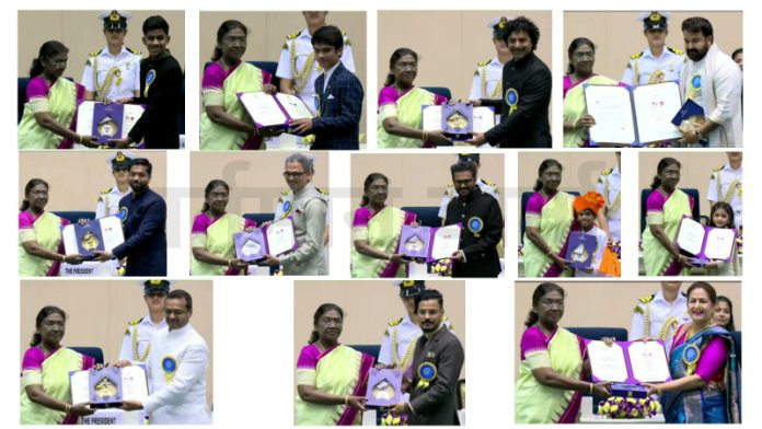नवी दिल्ली : भारतीय चित्रपटसृष्टीतील सर्वोच्च सन्मान मानल्या जाणाऱ्या 71 व्या राष्ट्रीय चित्रपट पुरस्कारांचे वितरण आज विज्ञान भवन येथे राष्ट्रपती द्रौपदी मुर्मु यांच्या हस्ते करण्यात आले.या प्रसंगी मल्याळम सुपरस्टार मोहनलाल यांना ‘दादासाहेब फाळके जीवनगौरव’ पुरस्काराने सन्मानित करण्यात आले .या सोहळ्यात मराठी चित्रपटांनी आपली गुणवत्ता आणि वैविध्य सिद्ध करत राष्ट्रीय पातळीवर आपली छाप पाडली. ‘शामची आई’, ‘नाळ 2’ आणि ‘जिप्सी’ या चित्रपटांनी मराठी सिनेमाची श्रीमंती अधोरेखित करत विविध श्रेणींमध्ये पुरस्कार पटकावले.