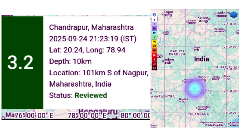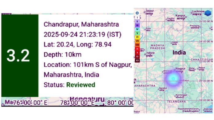 चंद्रपूर, महाराष्ट्र – 24 सितंबर 2025 की रात 9:23 बजे चंद्रपूर जिले में 3.2 तीव्रता का भूकंप महसूस किया गया। भूकंप का केंद्र स्थल 20.24° उत्तर अक्षांश और 78.94° पूर्व देशांतर पर 10 किलोमीटर की गहराई में स्थित था।