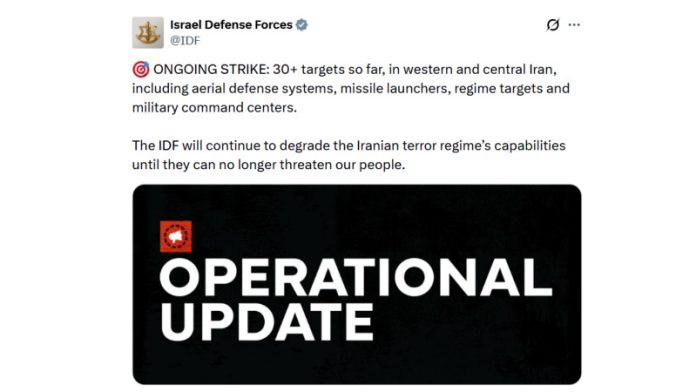 विदेश : मध्य पूर्व में तनाव एक बार फिर बढ़ गया है। Israel Defense Forces (आईडीएफ) ने दावा किया है कि पश्चिमी और मध्य ईरान में अब तक 30 से अधिक ठिकानों पर हमले किए जा चुके हैं और सैन्य कार्रवाई अभी भी जारी है।