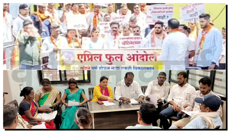 बुधवार दोपहर करीब 1:30 बजे नगर परिषद कार्यालय परिसर में भाजपा नगरसेवकों ने अनोखे अंदाज में ‘एप्रिल फूल’ आंदोलन किया। सत्ताधारी पक्ष के खिलाफ नारेबाजी करते हुए आंदोलनकारियों ने आरोप लगाया कि पिछले चार महीनों में एक भी ठोस विकास कार्य नहीं हुआ और शहरवासियों को लगातार “एप्रिल फूल” बनाया जा रहा है। इस दौरान मुख्याधिकारी कार्यालय में ‘एप्रिल फूल बनाया’ गीत बजाकर प्रतीकात्मक विरोध जताया गया और निवेदन सौंपकर नाराजगी व्यक्त की गई।